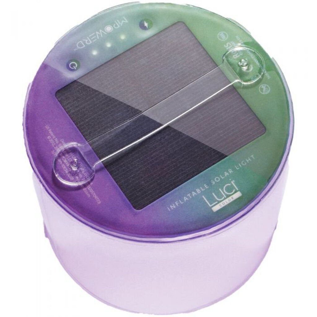 Luci made colorful. With 8 bold hues, a sparkle finish, and lasting up to 9 hours on a single charge, this solar lantern is perfect for adding a splash of color to your life.  • 8 colors: red, green, blue, purple, yellow, cyan, orange,    and white • Sparkle finish • RGB LEDs • Lasts up to 9 hours on a single charge   (see details under "tech specs" below) • Recharges in 7 hours. Get to know the product a little better.  Product features • Sparkle finish • 10 multi-color LEDs • Fixed base strap • Durable: withstands up to 150 lbs of pressure • Lightweight: 4.4 oz (125 g) • Waterproof: IP67 • Operating temp: 32ºF – 113ºF (0ºC – 45ºC)  Product functions • 8 colors: red, green, blue, purple, yellow, cyan, orange, and white • Color cycle mode + 8 unique colors • 2 second quick shut off • Battery level indicator  Battery life • Red: 7 hours • Green: 9 hours • Blue: 7 hours • Purple, yellow, cyan, organge, and white: 5 hours  Charge • Recharges in 7 hours • Recharge via direct sunlight • ...